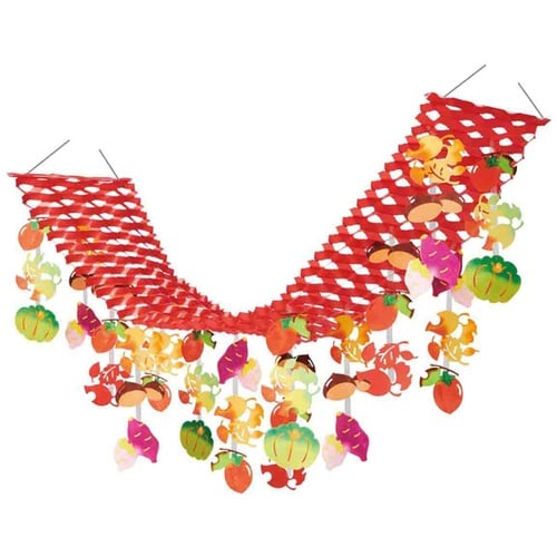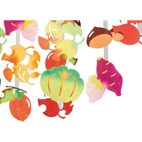 秋の味覚が詰まった、食品売り場におススメのプリーツハンガー。天井から吊るすだけで簡単に秋らしい店舗装飾になります。 |