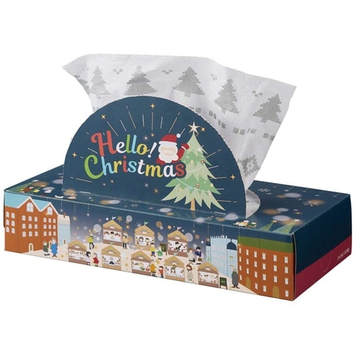 クリスマスマーケットをテーマに、人々が外に出かけて楽しく過ごす様子をデザインしたティシュペーパー。もらってうれしいノベルティ。クリスマス柄の箱ティッシュはクリスマス会やイベントの景品におすすめです。 |