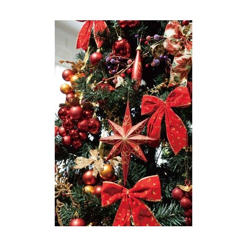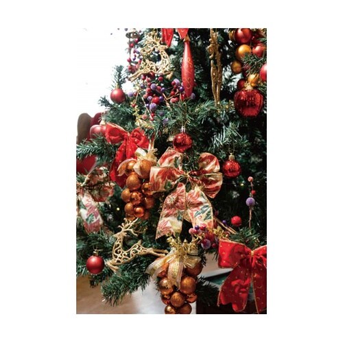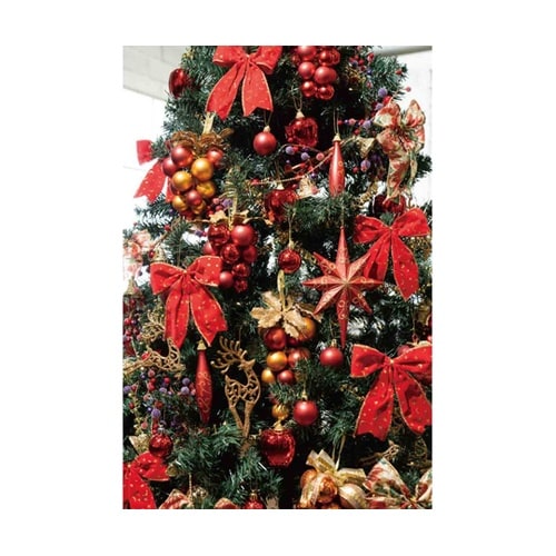 盛りだくさんな装飾で華やかに飾り付け。足元ベース付きの豪華ツリーです。 |
