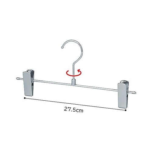 シンプルで使いやすいハンガーです。ボトムハンガーの写真内のサイズ表記はクリップ間の最大値です。フックは回転します。 |