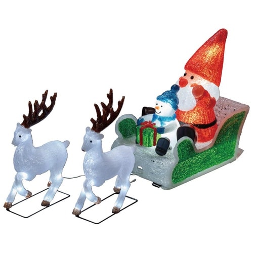 2頭のトナカイが、サンタクロースと雪だるまが乗ったソリをひいています。屋外でも使えるかわいいイルミネーションでライトアップして集客アップ。 |