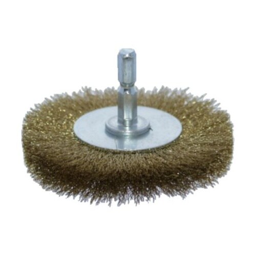 ブラシ形状が円盤型で、外側に向かって放射状に毛が植わっています。真鍮、銅製品および合金製品の研磨。