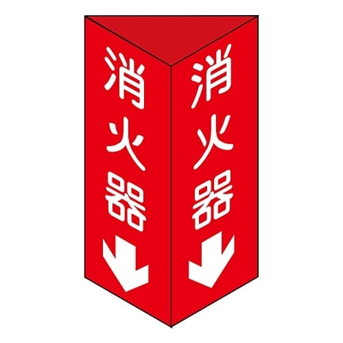 広範囲からの視認が可能な、消火器の設置場所を示す三角柱タイプの標識です。 |