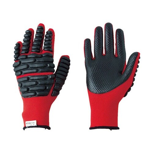 挟み事故による手の甲への衝撃を緩和します。緩衝材とすべり止め手袋の一体型タイプです。独立行政法人労働安全衛生総合研究所との共同開発製品です。物流の台車運搬。建築。採掘作業。 |