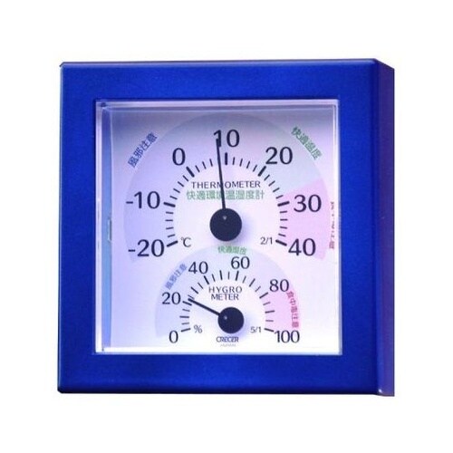 100mm角の小型な温湿度計です。快適環境か、文字盤の色でお知らせ背面に壁掛け用の穴があります。卓上で自立します。 |
