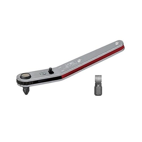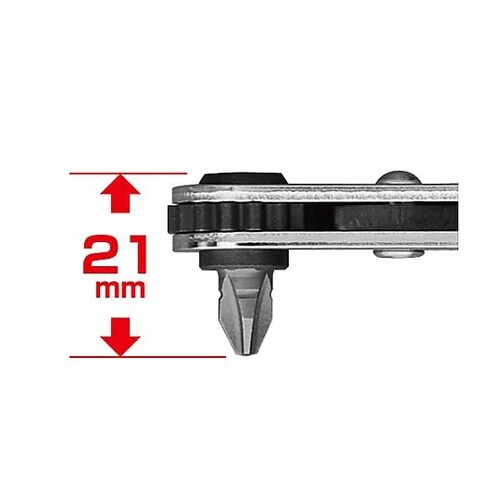 狭い箇所でのねじ回しにビット使用時でも厚さ21mmの薄型ヘッド部分持ち手を変えず、左右の反復回し動作でネジを回せるラチェット機構ハンドル差込部にマグネット付きRoHS2適合品 |