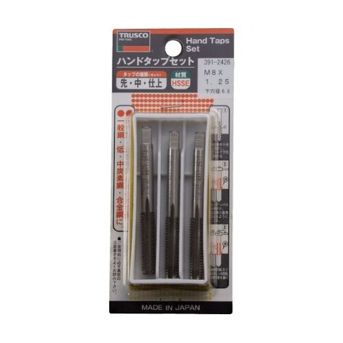 通り穴・止まり穴共に使用可能です。高速度鋼(HSS−E)のタップセットです。被削材:一般鋼、低・中炭素鋼、合金鋼。