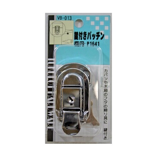 鍵付き。バネの力でしっかりと締めます。カバンや木箱などのフタの締り具に。取り付けの際、木部の割れやネジの破損を防ぐためキリで下穴を開けてください。 |