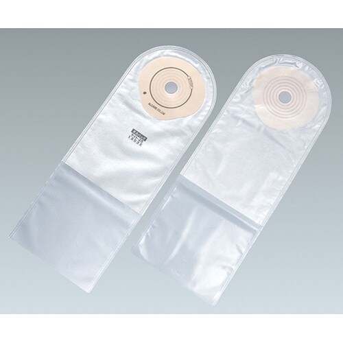 消化管ストーマ用。全体が平らな面板で、高さのあるストーマに適しています。下部に便排出口があるストーマ袋です。交換目安は1日。面板には、しなやかな超薄型皮膚保護剤を使用しています。ストーマ袋は排出口が広
