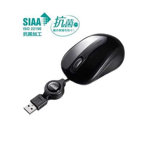 抗菌・静音有線巻取りブルーLEDマウス MA−MBSK315BK
