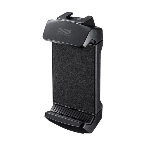 スマートフォンやタブレットを三脚に取り付けできるアタッチメントホルダーです。幅6−18cmまでのスマートフォンとタブレットに対応しています。ホルダーはスプリングネジで上下に締め付けて固定するタイプです |