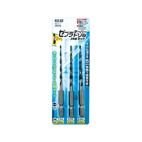 5mm幅でゼブラ模様に加工させているので、下穴の深さを2mm間隔で調節できます。木割れを防ぎ、素材の端に釘止めや木ネジ止めする時に最適です。木材・竹・プラスチック・石膏ボードの穴あけに。 |