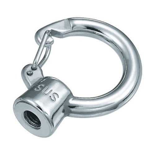 従来のアイナットに開閉できるフックが付いているので、設置後に物を通すこともできます。鳩除け・カラス除けネットなどの端末金具。 |