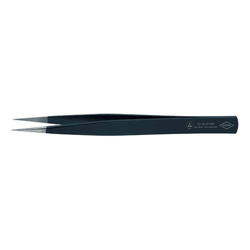 材質は非磁性のステンレス。ESDコーティング:表面抵抗約100000オームのつや消し黒仕上げ。先端部はつや消し仕上げ。部品をつかみやすい先端部。ストレートタイプつかみ面はフラットで、部品に傷をつけませ |