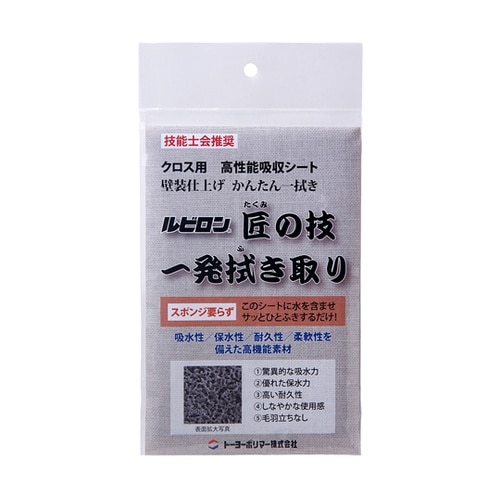 高機能壁紙接着剤拭き取りシートです。ウレタン多孔体”ルビーセル”を使用しています。優れた吸水力、保水力、高耐久性があり、優れた作業性から内装技能士会から推奨されています。 |