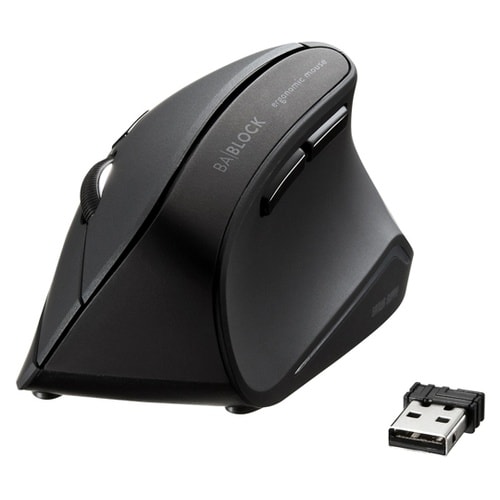 人間工学形状で、手首への負担が少ないエルゴノミクスデザインのワイヤレスマウスです。上から手を乗せるのではなく、横から軽く手を添えて使う新設計で、手首のひねりを軽減します。自然な角度でにぎることができる |