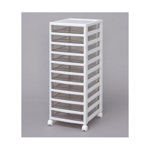 引出しの材質にスチロールを採用しているため透明度が高く、中身が確認しやすいクリアタイプのチェストです。引出しは飛び出しにくい、簡易ロック構造です。移動に便利なキャスター付きです |