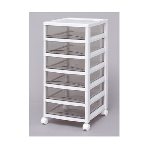 引出しの材質にスチロールを採用しているため透明度が高く、中身が確認しやすいクリアタイプのチェストです。引出しは飛び出しにくい、簡易ロック構造です。移動に便利なキャスター付きです |