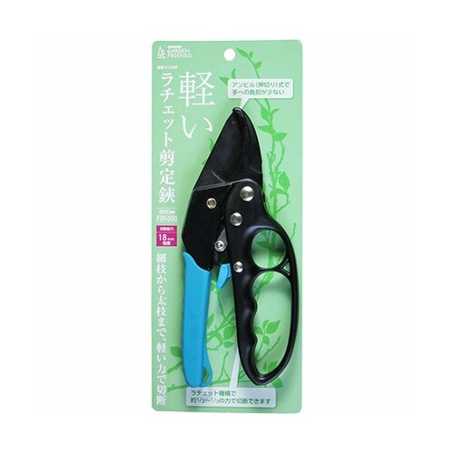 庭木の剪定、整枝作業に。生木でφ18mm程度の枝が切れます。4段ラチェット式とアンビル式 切刃が戻らずに1段階ずつ握り込めて、少しづつ押し切ることができるので、細枝から太枝まで軽い力で切断できます。手 |