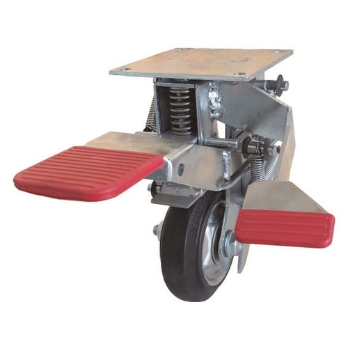台車の始動アシストとブレーキ機構が一つにまとまりました。中央ペダルの踏み込みで重い台車の始動をアシストします。台車への後付けが可能です。ストッパー解除と始動アシストをワンアクションで行えます。ロックス |