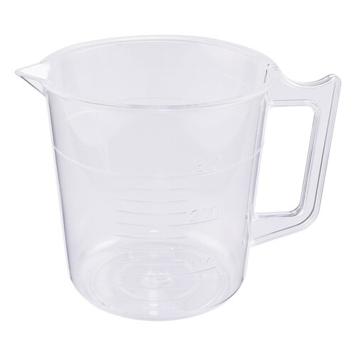高い透明度を持ち、外側に浮き出た成形目盛が計量をスムーズにします。一体成型品のため取っ手が外れません。本体が底部へ向けテーパーになっています。 |