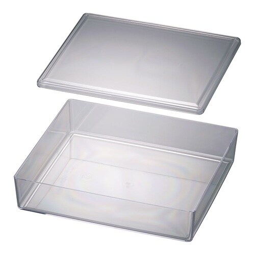 ポリカーボネイト製の蓋付バットは、衝撃に強く、内容物が外から一目で見分けられます。