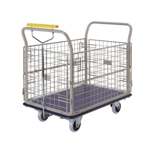 スチールの頑丈さ!塗装は錆にも強い粉体塗装仕上手を離すと自動でロックのかかるブレーキタイプ。坂道等でのご利用に便利な台車です網は長手側両サイドを開閉することができ、荷物の出し入れに便利です安心・安全・ |