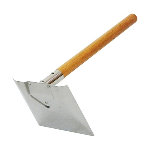 トロ舟で壁材を混ぜるときに使用するステン左官鍬。頭部は、サビにくいステンレス製。 |
