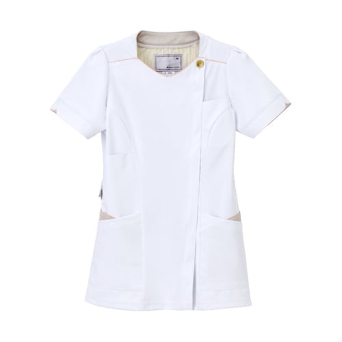 ネックレスを思わせるネックラインのデザインが華やかさと女性らしい優美さを演出します。ホワイトとベージュのカラーリングが落ち着いた雰囲気です。意匠登録済左胸(PHSポケット付き)、両腰Wポケット、右胸下 |