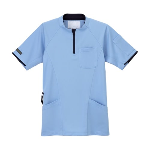 スポーティーですっきりとしたスタンド衿デザイン。エアーアームカットを搭載し、爽感素材を使用したプロファンクション仕様。ファスナーの引手が表に出ていないため安心してご着用いただけます。男女兼用左胸、両腰