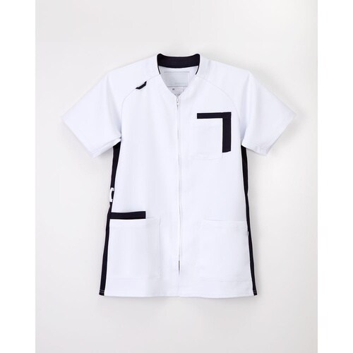 センターファスナー開き・ラグランスリーブの男女兼用スクラブです。胸ポケットを二枚ずらして重ねたデザインがスタイリッシュ。バックスタイルの両サイドに配したニット素材が動きやすさと涼しさを提供します。適度 |