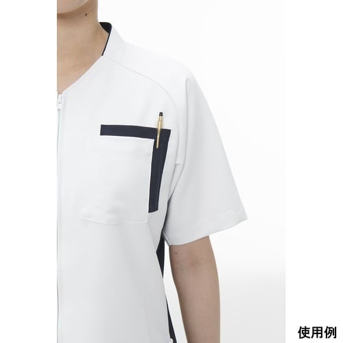 センターファスナー開き・ラグランスリーブの男女兼用スクラブです。胸ポケットを二枚ずらして重ねたデザインがスタイリッシュ。バックスタイルの両サイドに配したニット素材が動きやすさと涼しさを提供します。適度