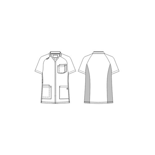 センターファスナー開き・ラグランスリーブの男女兼用スクラブです。胸ポケットを二枚ずらして重ねたデザインがスタイリッシュ。バックスタイルの両サイドに配したニット素材が動きやすさと涼しさを提供します。適度