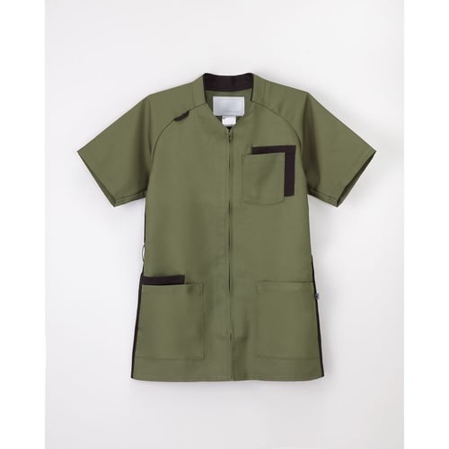 センターファスナー開き・ラグランスリーブの男女兼用スクラブです。胸ポケットを二枚ずらして重ねたデザインがスタイリッシュ。バックスタイルの両サイドに配したニット素材が動きやすさと涼しさを提供します。適度
