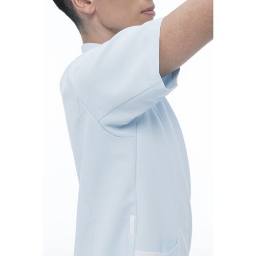 アシンメトリーな襟元が新しさを感じさせる男女兼用の前ファスナー開きスクラブです。エアーアームカット機能を搭載しているため肩回りの動きに対するストレスを大幅に軽減します。