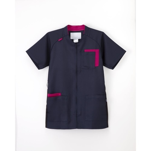 センターファスナー開き・ラグランスリーブの男女兼用スクラブです。胸ポケットを二枚ずらして重ねたデザインがスタイリッシュ。バックスタイルの両サイドに配したニット素材が動きやすさと涼しさを提供します。適度