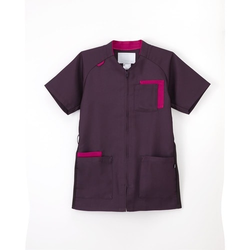 センターファスナー開き・ラグランスリーブの男女兼用スクラブです。胸ポケットを二枚ずらして重ねたデザインがスタイリッシュ。バックスタイルの両サイドに配したニット素材が動きやすさと涼しさを提供します。適度