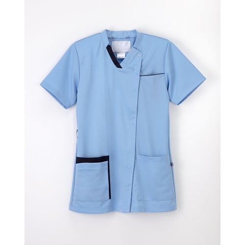 カットが入った衿、ポケットのデザインが新しさを感じさせてくれる男女兼用スクラブです。通気性・伸縮性抜群のニット素材を使用し、ループが直接肌に当たりにくいタブ付きの高機能デザインです。