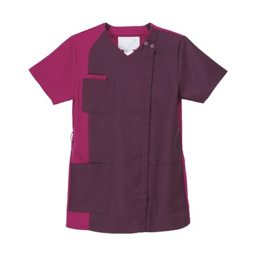 アシンメトリーなデザインが新鮮で自由なイメージのスクラブです。涼感機能のあるニット素材の使用量を従来品の2倍に増やし、動きやすさと通気性をアップさせています。適度なゆとりのあるシルエットになっています |