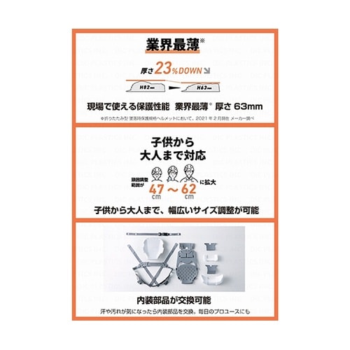 コンパクトに収納できるため、携帯・備蓄に便利です。内装交換可能で出張現場へ携帯するへルメットとしても適しています。 |