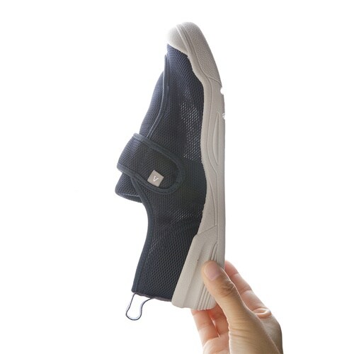 洗濯機で丸洗いでき、通気性の良いメッシュ生地なので速乾性にも優れています。しっかりした「かかと芯」と「靴底」でリハビリ歩行に適しています。