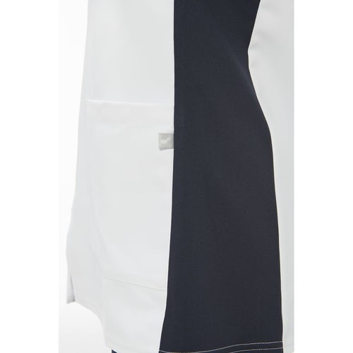 センターファスナー開き・ラグランスリーブの男女兼用スクラブです。胸ポケットを二枚ずらして重ねたデザインがスタイリッシュ。バックスタイルの両サイドに配したニット素材が動きやすさと涼しさを提供します。適度