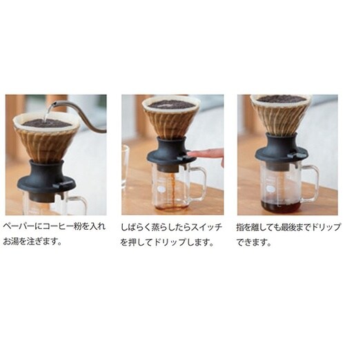 コーヒー粉をお湯に浸漬(しんし)してから抽出するドリッパー。スイッチを押してドリップするので、どなたにでも均一な抽出が可能です。2019 年度グッドデザイン賞受賞 |