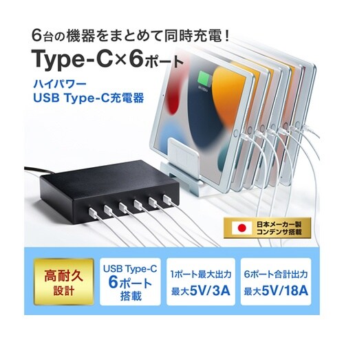 USB Type−C充電器(6ポート・合計18A・高耐久タイプ) ACA−IP81