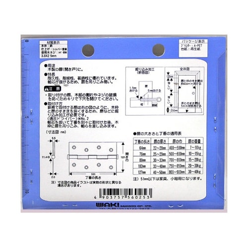 耐久性、耐侯性、装飾性に優れています軸芯が抜けるため、扉を吊りこみ易い木製の扉(開き戸)に(掘込み型)取り付けの際、木部の割れやネジの破損を防ぐためキリで下穴を開けてください。 |