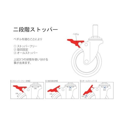走行音が静かで、床にスリップ痕がつきません。ペダルを踏むことによりストッパーフリー、旋回固定、オールストッパーを使い分けることができます。騒音を嫌う環境での運搬用に。