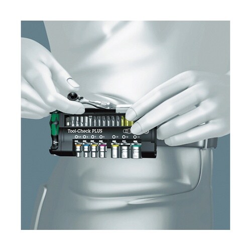 コンパクトなカードタイプのケースに、ラチェットハンドルと使用頻度の高いビット、ソケットを収納しています。 |