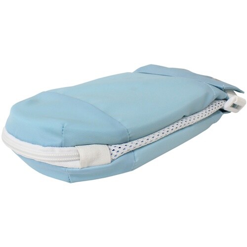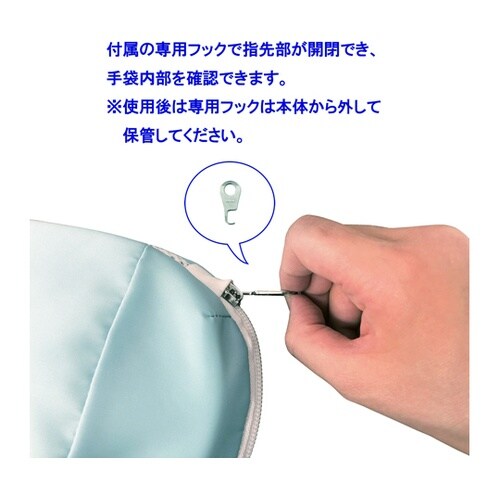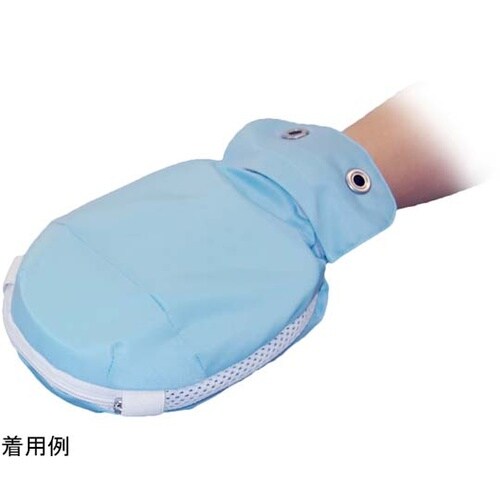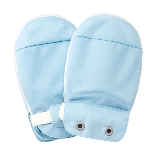 保護パッドにより、物がつかみにくい形状になっています。手首ベルトの上からアイデアホック付あまぶた(取り外し可能)をかぶせて留めるため、使用者ご本人にはミトンを外しにくい構造になっています。先端部のファ |