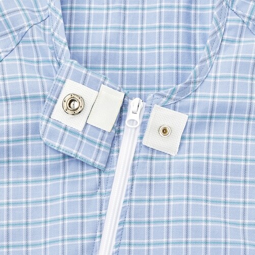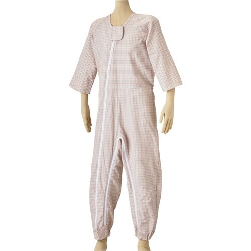ロック機能付きファスナーとホックカバーで本人の開閉を防止します。首元から足元までのオープンファスナーで着脱が容易にできます。スライダーが破損した時に、容易に交換することができます。 |