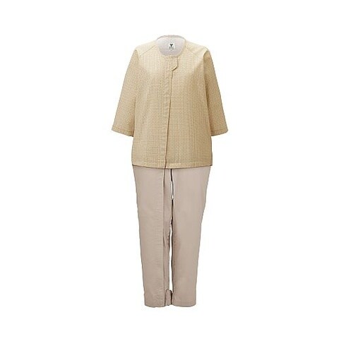 普段着にも使えるつなぎねまきに見えないセパレート風デザインご本人では開けにくいアイデアホックを使用した介護用つなぎねまきアイデアホックが表から見えないデザインを採用セパレート風なデザイン胸元から右足首